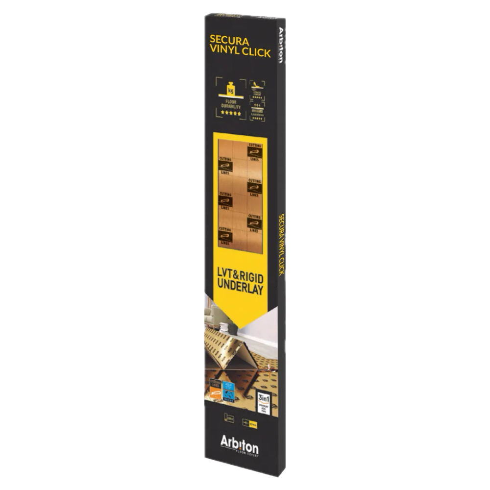 Podložka Arbiton Secura Vinyl Click ponúka jednoduchú montáž vďaka integrovanej lepiacej páske a parozábrane Aquastop, ktorá chráni podlahu pred vlhkosťou z podkladu. Vďaka nízkemu tepelnému odporu je vhodná na podlahové vykurovanie. Určená je pre vinylové podlahy s click systémom, nie pre lepené vinylové podlahy.